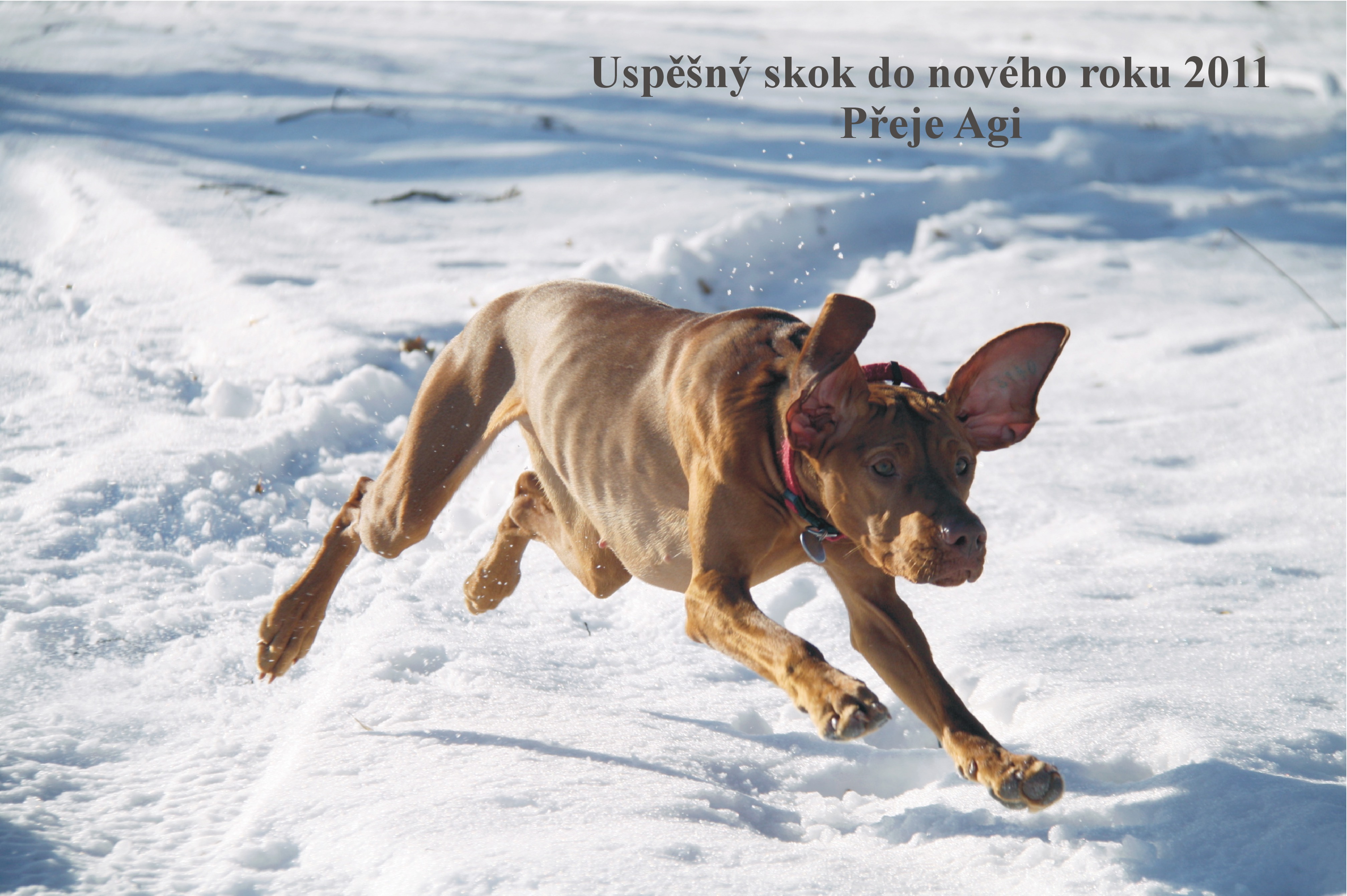 Konec roku na krku a já jsem do toho začala kulhat. Páníci netuší proč, ale vždycky po delší procházce si šetřím pravou přední packu. Prý že simuluju, páč venku lítám jak pošuk. A taky míň žeru, nad granulkama ohrnuju pysk, tak mi jich začali dávat míň, škrti. Místo aby mi koupili pořádnou flákotu z prasátka. Přátelé, jak už naznačnuju v PFku, úspěšný start do nového roku, hodně kynologických, loveckých i osobních úspěchů a ať je ten následující rok 2011 stejně tak podařený jako ten letošní. Zdar. Vaše Agi